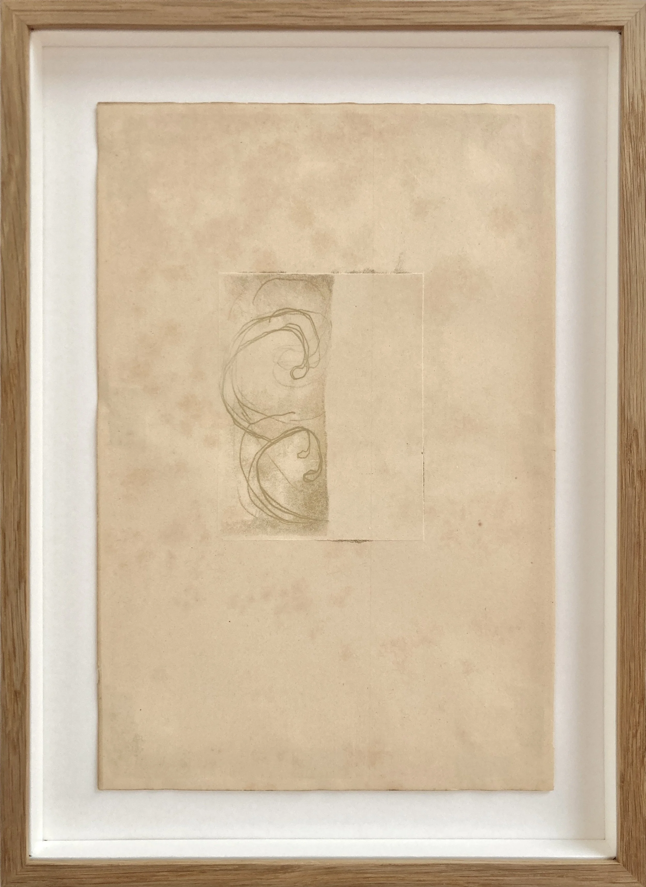 Erasure, 2023, monotype: water based ink on vintage paper Float mounted in natural oak 0.9cm wide box frame Anti-reflective / UV resistant glass Unframed 27x17.5cm / framed 33.3 x 24.1 cm