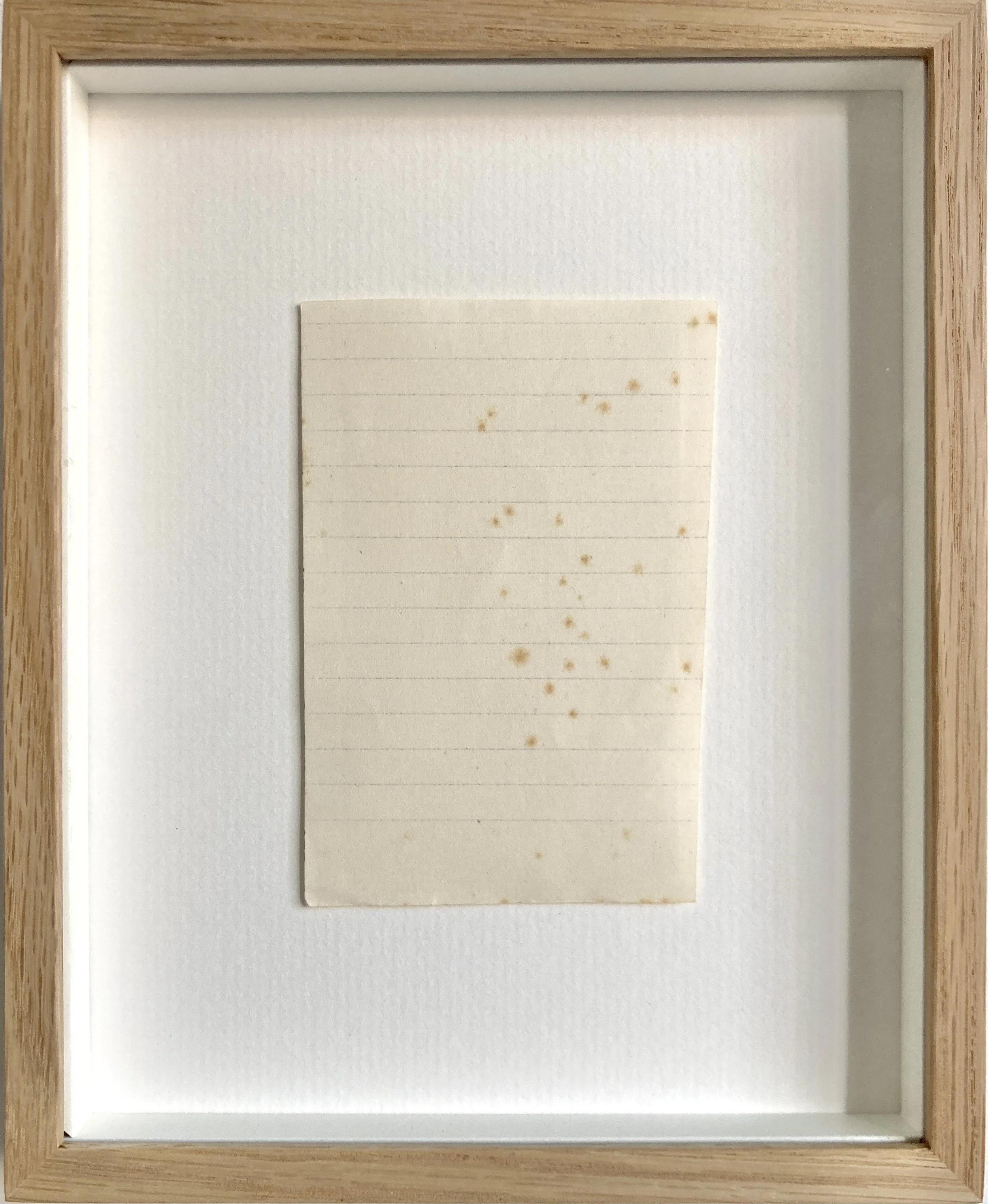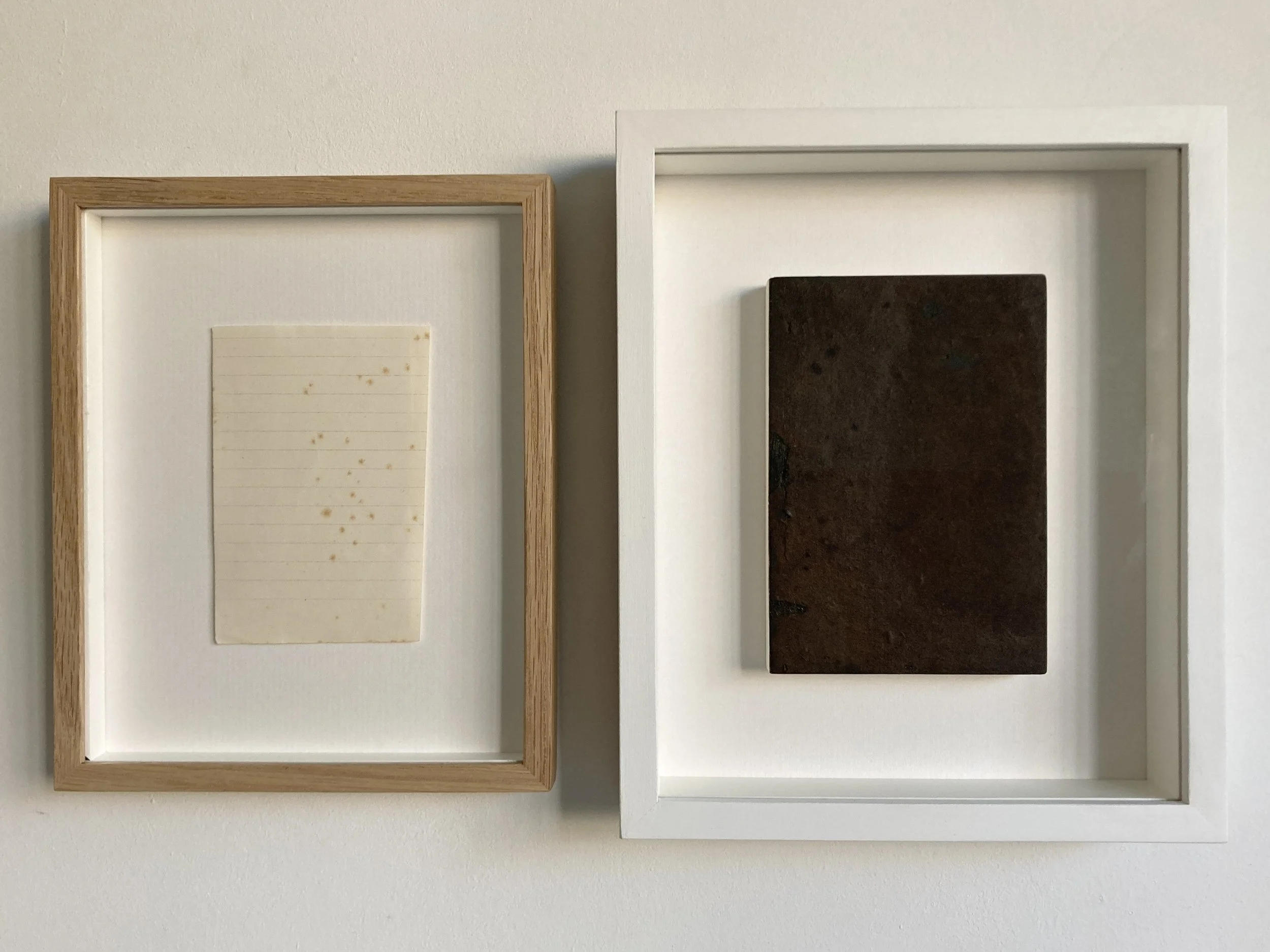 I return there in my dreams (diptych), 2021-2023, vintage paper, oil and gesso panel Unframed 11.5x8cm and 14x9.5cm / framed 21.9x17.8cm and 24.8x20.5cm Float mounted in natural oak and hand painted white solid wood 0.9cm box frames Anti-reflectant, UV-resistant glass